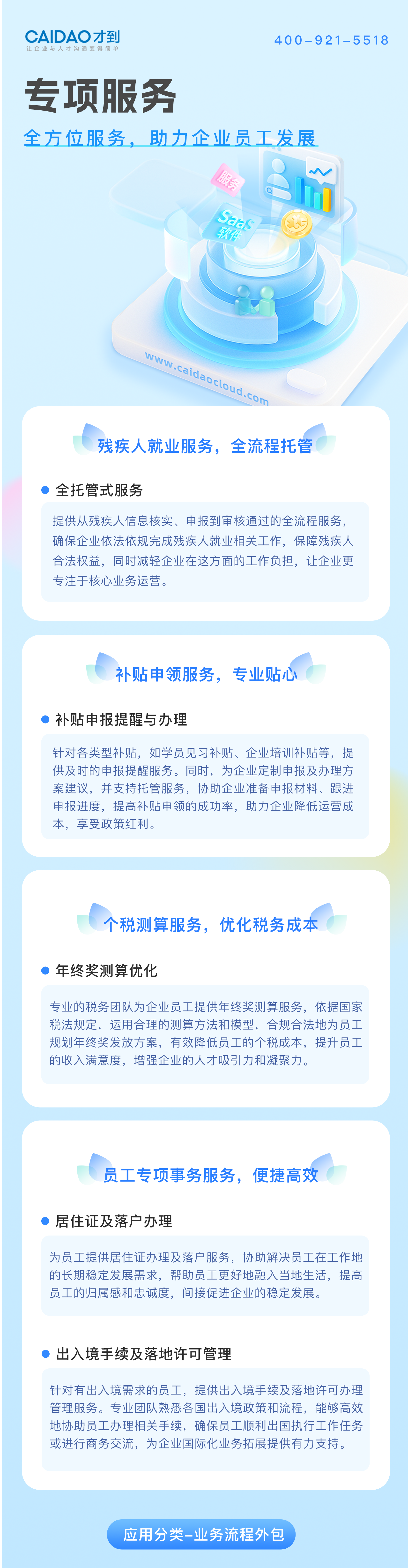 全方位了解才到云的一站式 HR SaaS 应用的功能与优势,涵盖薪酬管理、假勤管理、组织人事、入职管理、合同管理等核心模块,以及这些模块间的无缝协作模式,为企业带来便捷、精准且实时的人力资源管理体验。 熟悉才到云 BPO 整体人力资源解决方案的精髓,包括人事事务外包(社保公积金解决方案、薪酬外包、考勤外包、员工全生命周期外包)、招考流程外包等方面的专业方案,结合您企业实况,帮助您通过优化人力管理流程助力企业成功。
