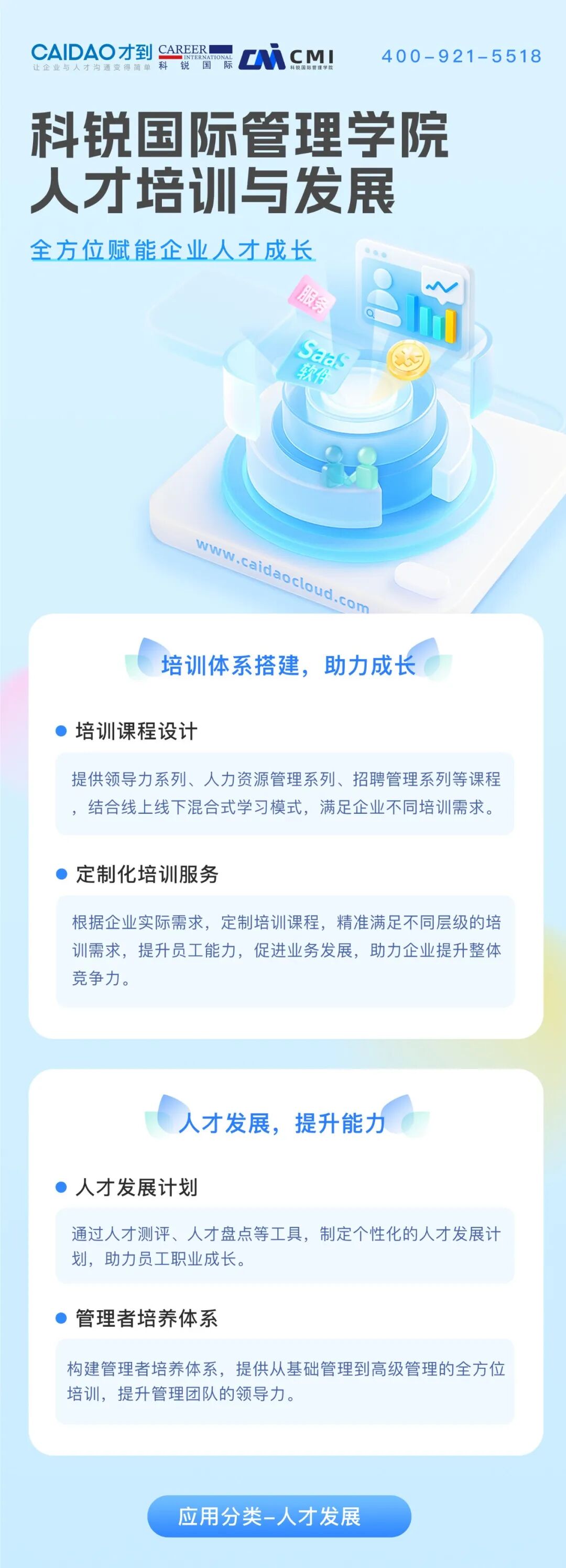作为才到云的重要合作伙伴,与科锐国际的业务协同进一步拓展了才到云的服务边界,丰富了服务场景,让才到云不仅能够为您提供全场景数智化的人力资源管理工具和服务,还能借助科锐国际管理学院人才培训与发展等服务,进一步完善您企业的人才战略,赋能企业持续敏捷增长,助力企业在激烈的市场竞争中脱颖而出。